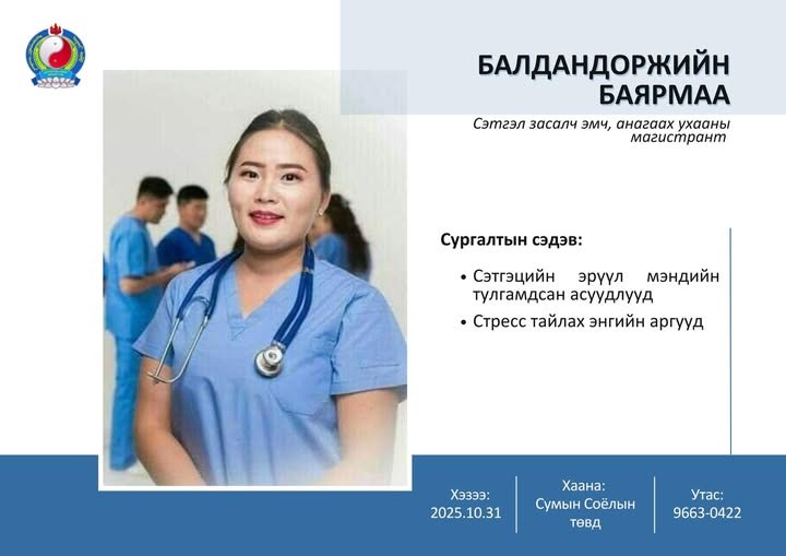 /2025.10.31/ Сумын Гэмт хэргээс урьдчилан сэргийлэх ажлыг зохицуулах салбар зөвлөлөөс санаачлан Сэтгэл засалч эмч, анагаах ухааны магистрант Б.Баярмаа "Сэтгэцийн эрүүл мэндийн тулгамдсан асуудлууд", "Стресс тайлах энгийн аргууд" сэдвээр сургалт зохион байгууллаа. Тус сургалтад 52 иргэн хамрагдаж, 8 иргэн ганцаарчилсан зөвлөгөө авсан.